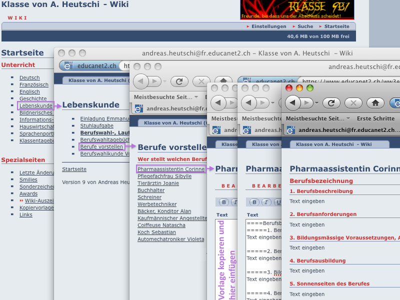 - Die Lehrperson bereitet im Wiki die Seiten vor, auf denen die Lernenden die Vorlagen einsetzen werden (siehe Bild: Beispiel "Berufe vorstellen" im Fach "Lebenskunde").